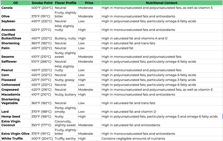 This chart covers a range of cooking oils and fats, from the most commonly used to the lesser-known, providing information on their smoke points, flavor profiles, prices, and nutritional content.